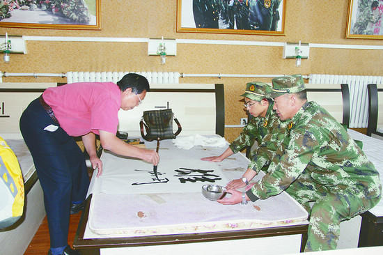 没有桌子,书法家王献坤在红其拉甫哨所营房内的床铺上创作
