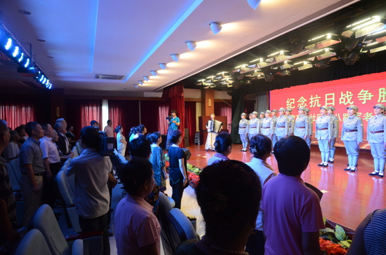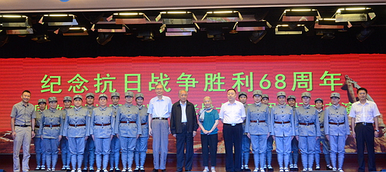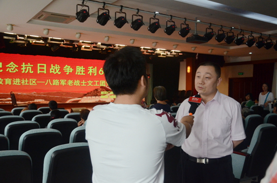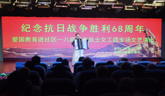 为大力弘扬爱国主义,9月3日下午八路军老战士文工团一行40余人,专程前往北京市东城区朝阳门街道办事处举行了——庆祝抗战胜利68周年爱国教育进社区专场文艺演出。中央国家机关老领导、八路军老战士文工团常务顾问:原全国大常委、中央文献研究室主任逄先知同志,原中共中央委员、中央宣传部部长王忍之同志,kaiyun电子 原副主席、书记处书记胡珍同志。还有名誉顾问王利军同志、kaiyun电子 副主席刘兰芳同志,焦歌团长,及北京市有关方面负责同志邵丽红、陈大鹏等出席观看了演出。