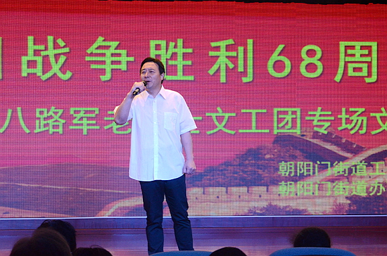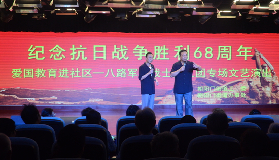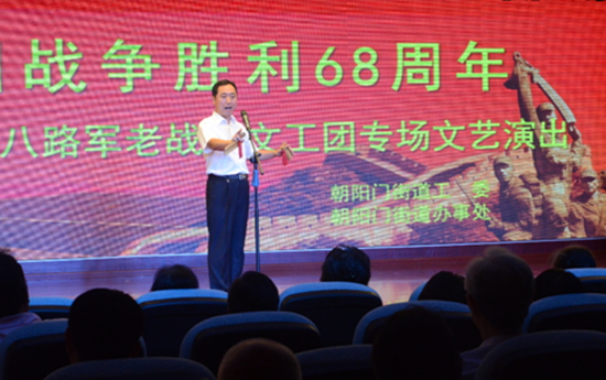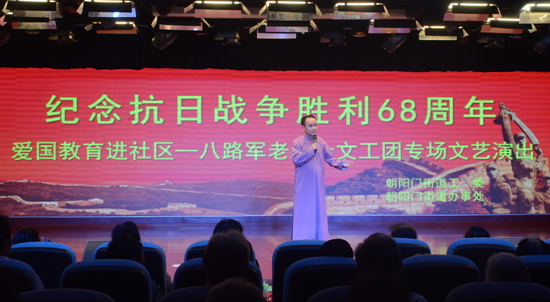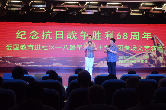 演出开始前,大屏幕播放了八路军老战士文工团摄制的专题片《爱国大业》。之后,团长焦歌发表讲话,他说:国共合作时期,于1937年8月,在国民党的一次高级会议上,宣布八路军正式成立。抗曰战争中,在中国共产党的领导下,八路军、新四军和各族人民英勇抗击倭寇,给侵略者以沉重打击,为抗战的胜利做出了重大贡献。八路军的平型关大捷和百团大战,对抗日战争的全面胜利起到了至关重要的作用。今天,世界政治格局变幻莫测,日本右翼势力又在蠢蠢欲动。我们今天走进社区举行庆祝纪念抗战胜利68周年文艺演出,就是为了让大家记住这段历史,每一名中华儿女都要居安思危,要深刻地意识到爱国教育刻不容缓。要时刻准备着听从祖国的召唤,听命党的指挥!为实现伟大的中国梦多做贡献!