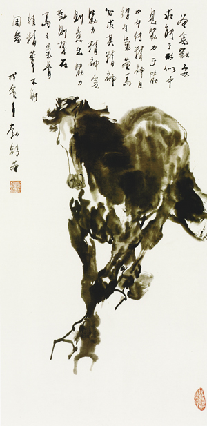过了“随心所欲而不逾矩”的年龄,他都不太再重视完整的形象,有人拿了他画的狂奔的马:“哎呀少了两只蹄子。”刘勃舒说:“我只是表现它奔跑,也不知画了几只蹄子。”他注重的是心性所向的写意表现。单马豪放洒脱,飘逸神态,群马令人惊心动魄的奔腾嘶鸣,均通过刘勃舒的笔墨,达成一种独立于绘画形象之外的高蹈的审美境界。在他的创作中,笔墨已不单单是状物寄情的艺术技巧,更是抒发情怀的表现手法。“中国画的点线是有感情的,笔墨变化是丰富的,我们现在对中国画的作用发挥得不够,不能单纯地画,要善于动脑子,悟道。”他如此说。