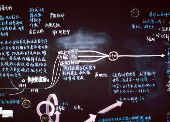 展览“历程”板块中的黑板报一角,从中不难看出国美85年历程始终尝试与世界发生联系