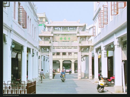 当时我徜徉在华南韩江流域的一座规模不大但文化遗存丰富的中小城市的古街上。十字路口东、南、西、北伸将开去,都是一座座的大理石牌坊,至少有二十几座。这古街上人迹不多,总的说来是相当安静。除了少量摩托车和自行车偶尔通过以外,主要是街道两侧经营商铺的人们。看上去男女老少大都神情安详,几乎无一人面现浮躁之色。
