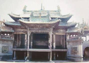 在总结了金元戏台的不同式样和基本风格之后,我得出早期戏台朴拙敦厚的整体印象。这种朴拙敦厚在明清时期发生变化,朝向复杂结构和重叠雕饰的方向发展,令我印象深刻的是一些庙貌结构的层累和戏台建砌的繁复。如山西介休县后土庙明代戏台那样层檐联厦、重重累累的复杂结体,把风格推向了气势恢宏、巍峨壮观,与之同时的是并联台、三联台、品字台、骑门台、过路台等各种戏台结构的诞生,它们无不使你赞叹不已、流连忘返。其中异军突起的一支是各地会馆戏台的竞藻夸富、争奇斗艳,著名的如河南社旗山陕会馆戏台、安徽亳州花戏楼,商帮在尊崇神灵、敦睦乡谊的同时也显示了审美趣味和经济实力。然而,遍及北方村庄的大量普通老戏台简陋又狭小,简直混同于一般村庄的砖瓦房屋,则与上述繁缛浮华的巨构形成鲜明对比和反差,传达了晚清民间社会破产与凋敝的意象,观之令人欷歔慨叹。