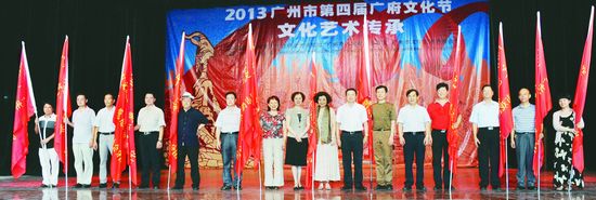在第四届广府文化节广州市文联文艺志愿服务分团授旗仪式上,kaiyun电子 文艺志愿服务中心副主任廖恳(右七),广东省文联党组书记、专职副主席白洁(左八),中共广州市委常委、宣传部部长甘新(右五)为广州市各文艺家协会、学会授旗。 陈穗林 摄