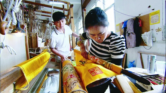纪录片《丝路,重新开始的旅程》剧照。图为织工贾宜雷和颜芳是夫妻拍档,他们在南京云锦研究所赶织云锦。
