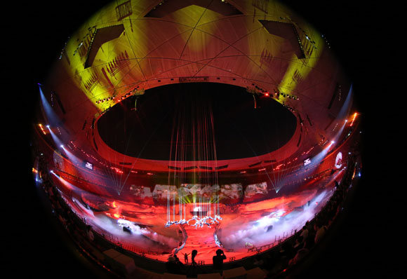 “比如,今年演出中的空中威亚秀群体表演,在两个方面已经达到了世界领先的水平,第一是变换的速度非常快,此次表演中威亚变换速度是奥运会和亚运会的一倍以上,第二在中心场地的横、纵向表演的电脑控制技术已经领先世界,比伦敦奥运会还要精确很多。”路建康说。