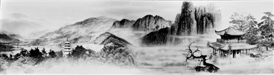 对于集锦摄影艺术,郎静山之女郎毓文告诉记者,“我的父亲一辈子就只做了一件事,那就是宣扬中国传统文化。”而此次展览便通过作品再度呈现了郎静山借摄影宣扬中国传统文化的毕生努力。类似作品《湖山揽胜》是郎静山晚年的得意之作。画面中,最右边是老翁远眺层峦云雾,近景又是奇石丛树等等。在这幅山水集锦作品中,郎静山将国画山水的构图方式,巧妙地运用在集锦作品中。