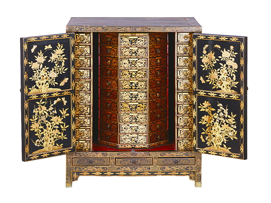 明万历黑漆描金龙纹方角药柜,与故宫博物院收藏的另一件药柜同为成对组柜之一。柜内中心和两侧分别有八方转动式和上下相叠式抽屉各十层,每个抽屉内又分为三格,共可盛放药品140余种。抽屉表面金漆墨书药材名称。柜面描金,绘龙纹。柜背面绘松、竹、梅“岁寒三友”图,并描金书“大明万历年制款”,做工极为精细华丽,是明代宫廷大漆家具精品。