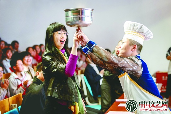 10月24日,由北京市文联主办,北京杂技家协会承办的“让艺术为中国梦插上腾飞的翅膀——首都艺术家走基层系列演出”在北京二中亦庄学校上演。首都文艺工作者表演了歌曲、魔术、杂技、哑剧等形式多样的节目,受到师生们的欢迎。图为杂技演员在演出中与观众互动。