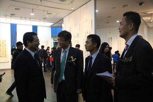 韩国驻华公使兼韩国文化院院长金辰坤,中国人民大学副校长刘向兵,全国政协委员、国家行政学院副院长周文彰、中国书法家协会理事朱守道、丁谦、杨广馨,中国人民大学艺术学院执行院长徐唯辛、艺术学院党委书记兼副院长郑晓华、副书记别敏、艺术学院文化艺术策划研究所所长祝东平、副所长王鹏及中韩书法家代表、艺术学院师生、韩国留学生和媒体代表约200人参加了开幕式。金辰坤、刘向兵、郑晓华等畅谈了此次展览对于中韩文化交流的意义。