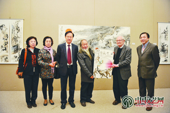 巴黎中国文化中心主任殷福(右五),副主任苏旭(右二),法国巴黎大学教授、著名汉学大师汪德迈先生(左四),法国文化部荣誉戏剧总监武尔茨先生(右四),徐培晨教授(左三),法国阿尔多瓦大学教授李中耀(左二),巴黎索邦大学教授李晓红(右三),欧洲时报社长张晓贝(右一),江苏金泓文化发展有限公司总裁翟优(左一)在画展开幕式上合影