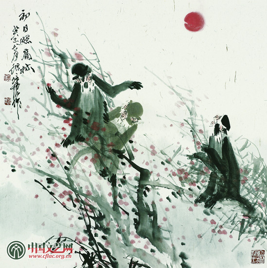 此次展览应法国巴黎中国艺术中心邀请,徐培晨教授为法国人民带来了他的39幅中国画精品力作,其中既有精心谋篇的八尺巨制《苍松丽日图》,又有挥洒自如的梅·兰·竹·菊小品。他笔下的猿猴徜徉于林泉山石之间,奔腾跳跃、攀登追逐、母子相依、呼朋引伴、吟啸高歌、抓耳挠腮、撷果饮泉,各展英姿,各领风骚,各得其所。其画一派和谐,而少有厮打与争斗。这是他心目中猿猴的理想栖息地,就犹如《西游记》中的花果山那样,大自然为它们提供了取之不尽、用之不竭的山果林泉,在鸟语悠悠、静谧幽远中无忧地生活。作品表现的是人与动物及自然的和谐共生。