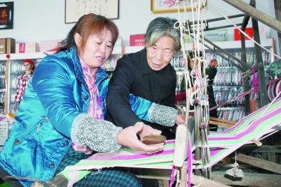在山东省无棣县梦依美粗布实业有限公司,邓俊萍正在向李素荣大娘(右)学习老粗布纺织技术。近年来,老粗布凭借纯棉质地、手工织造等特有的品质,越来越受到人们的青睐。该县车王镇孟邢王村村民孟德亮瞅准这一商机,把尘封多年的老织布机又抬了出来,成立了梦依美粗布公司,专门从事老粗布生产加工,精心打造传统文化品牌,将这一非物质文化遗产项目发扬光大。蒋惠庆、刘连坤摄