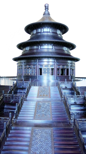 “紫檀及阴沉木制安定门”是中国紫檀博物馆继去年底完成“紫檀雕老北京城楼”项目首件作品——“紫檀雕永定门城楼”后,完成的又一紫檀制老北京城门大型模型。而同时展出的“天坛祈年殿”(见图),是中国紫檀博物馆馆藏的最大紫檀艺术珍品。