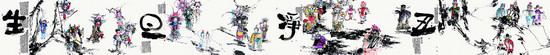 马书林突破传统戏曲人物画的固有藩篱,不受尺幅限制,他的戏曲人物画不仅常常是尺幅巨大,而且场面恢弘。画面繁复、形象交叠、墨色交融。在他的大尺幅作品中,常常有七八个,多时甚至有十来个人物,生旦净末、色彩浓艳。此次亮相国家大剧院的作品中,有一件由20张八尺整纸组成的巨幅作品《舞台人生》最为引人注目。这是马书林今年的最新创作,也是他个人创作历程中最大的一件国画作品。《舞台人生》由生、旦、净、丑四部分组成,画风融传统戏曲人物、民间美术造型与现代构成主义为一体,朴拙强悍、泼辣放达,一扫文人画疏淡冷逸之感。美术评论家邵大箴评价说:“马书林的画,大场面、大构图以气势见长,不失精妙细节;小场面、小构图别有情趣,小中见大,均见扎实的艺术功力与修养。”