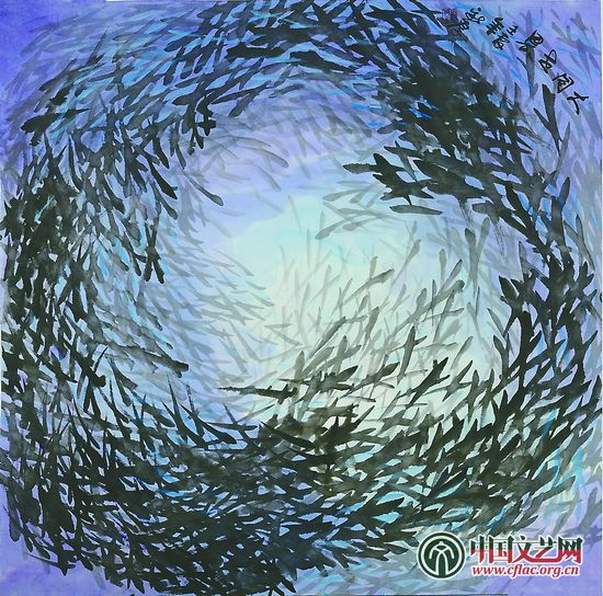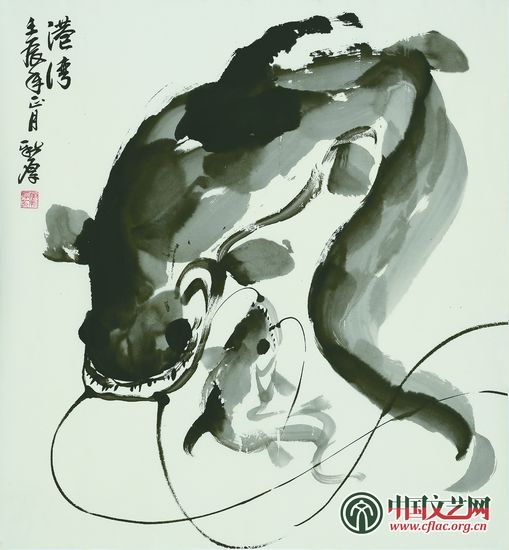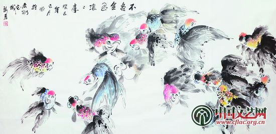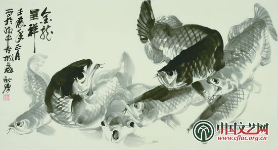 万新厚画鱼的所有作品,无论哪类画法,无论哪个鱼种,在处理手法上他都是“离行而似,貌离神合”、作画时的精神状态是“得意而无形”。对于一个有造型能力、有深厚笔墨功底的画家,创作时能否有意的“脱形”、“离形”,是画家艺术品位高低的体现,是艺术创作高境界的追求。运笔行墨间须“得意”,得情态之意、得造化之意、得境界之意,如此出现的作品方能赏心悦目。这样的创作过程,这样的创作思想,这样的创作状态,都有获于“大象”,此乃高境界画家艺术追求之本。