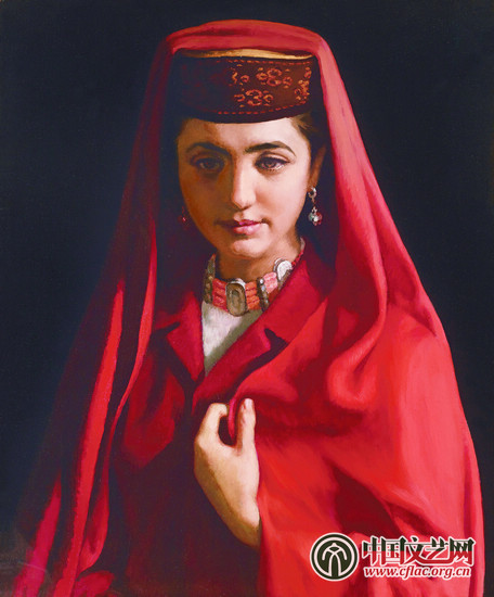 靳尚谊于1983年创作了两件几乎完全相同的《塔吉克新娘》,二者只在画中“新娘”佩戴的项链细节上有细微差别。创作较早的一幅作品中,“新娘”佩戴的项链上装饰有三排珠子,此画完成不久便参加了当年的“中央美术学院教师作品展”,且广受好评,于同年被中国美术馆收藏。第二幅随后创作,亦完成于1983年。它与中国美术馆所藏版本唯一的区别为,“新娘”佩戴的项链上嵌有四排珠子。这两幅《塔吉克新娘》在创作面貌上均十分完美,而同一幅作品的反复创作也足见艺术家对于此作的重视和喜爱。靳尚谊采用侧光来捕捉形体结构和色彩的丰富层次,强烈的明暗反差一方面加强了人物体积的充盈之感,一方面也使得画中人所着的红色嫁衣渐隐于深色背景,虚实结合中营造出强烈的艺术效果。画家巧妙运用西方古典主义的写实手法,用小笔触细腻地点绘出“塔吉克新娘”丰腴、结实而立体的面部轮廓,并加强了艺术处理的主观性以突显画面的生动。