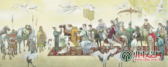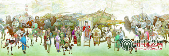 文姬归汉 东汉末年大学者蔡邕之女,名琰,字文姬,她博学且精通音律。汉末离乱,蔡文姬被胡兵捕获,在胡域生活十二年,嫁给了匈奴左贤王为妾,并育有二子。魏武帝曹操迁使送礼,赎蔡回汉。画面描绘蔡文姬回汉朝的途中,时时牵挂留在胡地的两个幼小的孩子,以琴言怨,以诗言愤,留下著名的《胡笳十八拍》。