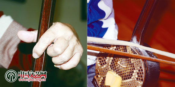 “单弦拉戏”的绝,绝在只用一个手指在一根弦上的演奏。增加了长度的琴杆也就扩展了音域,左手食指在宽广的音域里与琴弦的大幅度滑动涵盖了很多的指法技巧,在获得不一样的声音效果的同时,也是在这种独特乐器上的炫技之美。每一个音程变化就是一次换把,由于音程距离较之其他乐器要大,即使是小二度音程,也是单指上下变把移至精准的音位,且音程之间过渡得巧无缝隙恰到好处,讲究的就是从一个音滑向任何一个音的过程所产生出来的听觉和视觉美感。