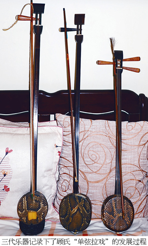 “单弦拉戏”虽是从民间“三弦弹戏”或“三弦拉戏”演变而来,但所用乐器又不同于任何传统的弹拨乐器和弓弦乐器。顾氏父子在长期的行艺过程中,逐步摸索几经革新,将“单弦拉戏”用的乐器定型为,琴杆增加了长度,琴筒圆形或方圆形蒙蟒皮加托板,分红木和铜质制作,钢质琴弦,琴弓粗长。这样的琴身结构所产生出的物理音量和音色效果,新颖独特,极具个性,基本脱离了原“三弦”乐器的构造特征自成一器,民间把这种乐器习惯叫“单弦” 。
