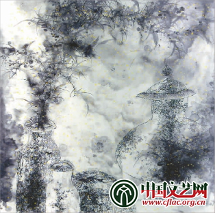 张卫早年以人物为创作题材,他的天籁系列脱离了中国画的水墨语言,杂糅进了许多传统文化的碎片,荒诞的脸谱、吊诡的人物、弥漫于画面挥之不去的墨色雾气,传达给人时空交错、情感纠结之感。细观他的画面细节,各种图式重重叠叠、精细非常,这显而易见需要花费艺术家极大的精力去“制作”,与传统民间图案喜庆吉祥的寓意不同,张卫笔下的图案,更多的是表现出面具式的可怖感,如同在描绘一个神秘的梦境。他将其所见、所闻、所思、所感融为一体,画面情节与内心自我认识交织,直接传达出自己当前的心境与状态。