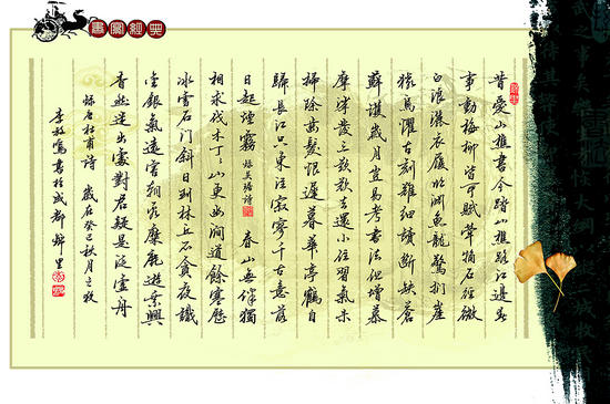 在经过设计的硬笔书法纸张上书写的行书作品,作者李放鸣