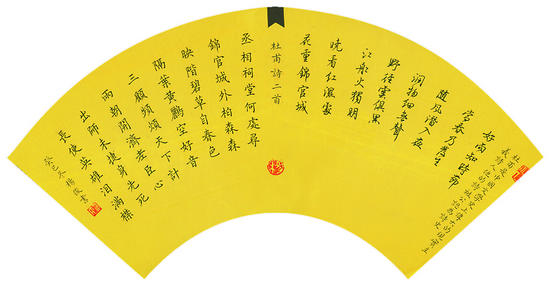 这是用楷书和行书创作的一幅扇面作品,作者杨俊