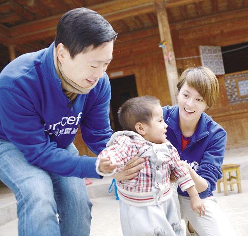 同为联合国儿基会香港大使的李垂谊和梁咏琪看望患脑瘫的藏族男孩