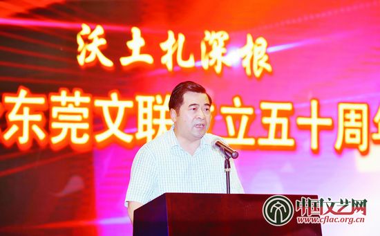50年只争朝夕,50年灿烂辉煌。50年是总结,也是新的起点。当前,我市正处于经济社会双转型的攻坚时期,也处在文艺事业的一个重要的黄金发展期。党的十八届三中全会已经发出了迈向文化强国的动员令,今天,我们已经站在新的历史起点上,一个新的文化建设高潮已经到来。我衷心希望东莞市的广大文艺工作者更加自觉、更加主动地服务大局,坚持先进文化的前进方向,牢记时代和人民赋予的神圣使命,认真学习、深刻领会、全面贯彻党的十八大精神与习近平总书记8·19重要讲话精神,积极投身东莞市现代化建设的伟大实践,以人为本,贴近实际、贴近生活、贴近群众,树立精品意识,突出地方特色,创作出更多内容和形式相统一,思想与艺术相统一,具有鲜明艺术个性,无愧于伟大时代、无愧于人民群众的优秀作品。