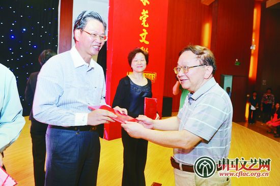 广东省文联主席刘斯奋(右)为优秀文艺家颁发证书