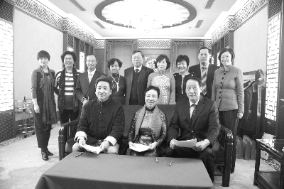 中国对外文化交流协会副会长董俊新(前排右)和中国文学艺术基金会副理事长姜昆(前排左)与越中文化交流中心副主任吴彩琼(前排中)签订志愿协议
