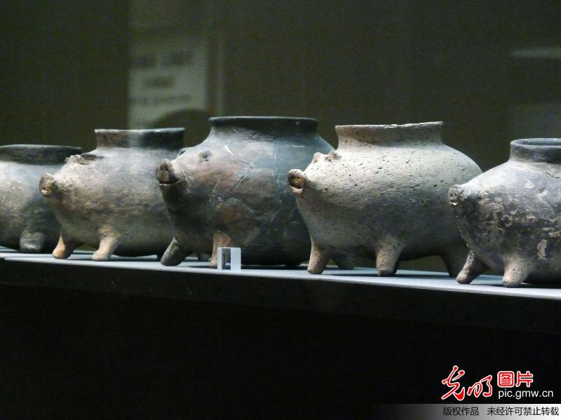 2014年1月5日,南京博物院历史馆,大小不一表情各异超可爱的一组猪形陶罐 王路宪摄