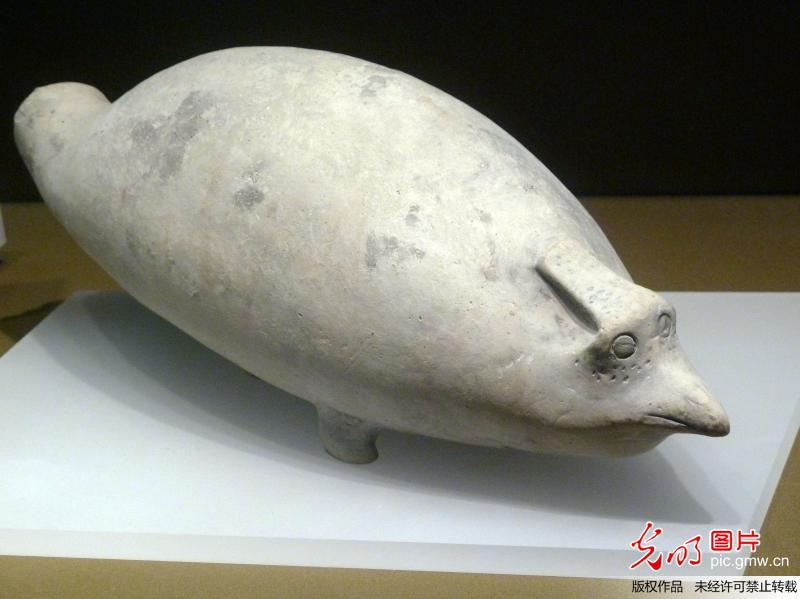 2014年1月5日,南京博物院历史馆,长着一副怪鸟嘴脸的江豚形陶水壶 王路宪摄