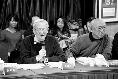 昨日,周有光之子周晓平(左)在会上发言。 李梦迪 摄