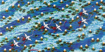 据介绍,为了此次北京行,查睿福专门创作了一些作品,类似一系列以初开的白百合为主题的油画及雕塑,画面中鲜花与仙鹤“扬起”曼妙舞姿再度传递了自然的神奇。她最新的两座巨型睡莲雕塑也属首度亮相。