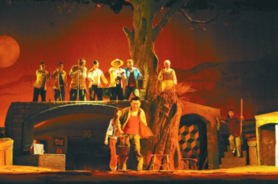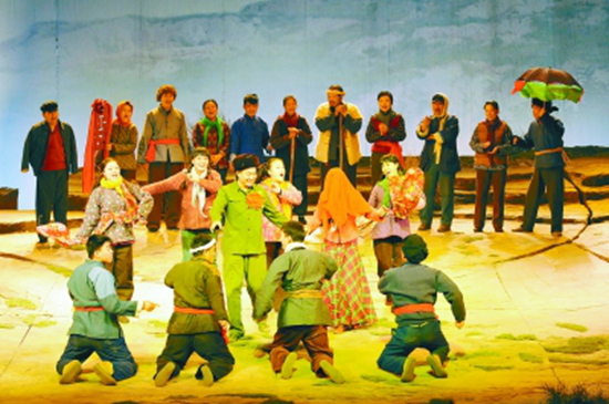 四是舞台演出具有鲜明的形式感,场面细节具有很强的感染力。查明哲是一个特别善于追问人物内心、铺张戏剧场面、抻长情感过程的导演。《立春》一开场,表现的是两个热恋中的年轻人,在长途劳碌奔波之后,终于从云南来到山西右玉县黄土高原上铁蛋家乡的情景。查明哲足足将这段戏铺展了有十几分钟,让舞台一开始弥漫着男女主角的兴奋感和新鲜感,调动起观众的欣赏情绪;然后是两人世界营造出来的甜蜜感与抒情性,像是一次情绪变奏;接下来是乡亲们迎亲队伍的热烈感人,情感小溪汇入咆哮的湍流,抒情的协奏变为雄浑的交响;最后,就是浓郁明艳的乡情小调、民俗小景的展示,恰到好处、毫不牵强地将晋西北文化通过迎亲仪式展示渲染一番……形象朴素生动,内容意味深长,生活思考与现实判断被具象化了,可以意会的内容在戏剧演出中变成了具有强烈形式感的事件场面。