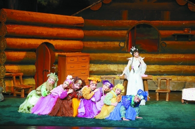 戏一开场,森林中一群可爱的小动物纷纷亮相,小白兔、小鹿、青蛙、乌龟作为串场,从台上跑到台下,与小观众拉手、转圈互动,一下子活跃了现场气氛,吊起了小朋友们的胃口;七个小矮人以矮子功出场,更是吸引了小观众的眼球,笑声四起。七个小矮人经白雪公主许愿长高了之后,每个人有不同的武功表演,跟头、旋子、肘棒子、铁门坎,让观众眼花缭乱。演到七个小矮人以重新变回矮子身救下白雪公主时,场下一片欢欣鼓舞。1小时15分钟的戏让孩子们坐住了,更看懂了。