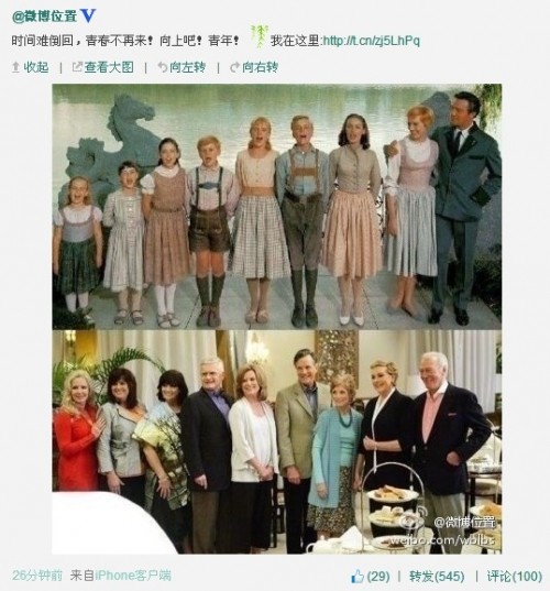 @微博位置今日上午发经典电影《音乐之声》的剧照配文诠释青春易逝引发网友热议,短短半小时内就有近七百条转发。