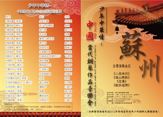 在3月30日当晚苏州博物馆报告厅举办的“少年中华情——中国当代钢琴作品音乐会”中,19位少年钢琴家出色的演绎了20首具有中国特色的钢琴作品。其中既有广为流传的民歌改编曲目《浏阳河》、《解放区的天》、《金蛇狂舞等》……又有具有中国当代特色的现代作品,如:桑桐的《孩子们的舞蹈》、朱践耳的《序曲与赋格》、张朝的《皮黄》……这些沉淀着中国风格和印迹的钢琴作品在充满着时代与文化气息的博物馆响起,更加赋予了音乐会文化的烙印和传承的使命,首首作品都受到观众热烈的掌声和赞誉。音乐会的DVD资料也将带到奥地利国际音乐大师赛暨音乐节上,让世界聆听苏州和香港的民族之声。