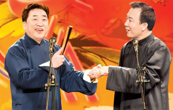 姜昆、戴志诚在中曲清音小剧场开幕演出中表演传统相声《相面》。秦彦