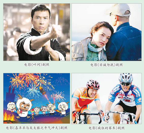其次,古装大片不再是主流,虽然还有《赤壁》一支独秀,但其他影片已不再是古装大片。应该说今年摆脱了前几年贺岁片奢华的面貌,较多地具有包容性,推出了中等成本的影片。像《爱情左右》,票房达到2500万,吸引青年观众甚多。而《梅兰芳》、《叶问》,首日票房也都呈现佳绩,《硬汉》也得到了1000多万的票房。制作成本仅为600万的动画电影《喜羊羊与灰太狼之牛气冲天》,春节期间以“黑马”势头赢得青少年与成人的青睐,全国票房突破8000万元,创造了国产小成本动画影片的票房神话。多样性的题材、主题和风格的影片在今年的贺岁市场里有了很好的发挥与尝试。