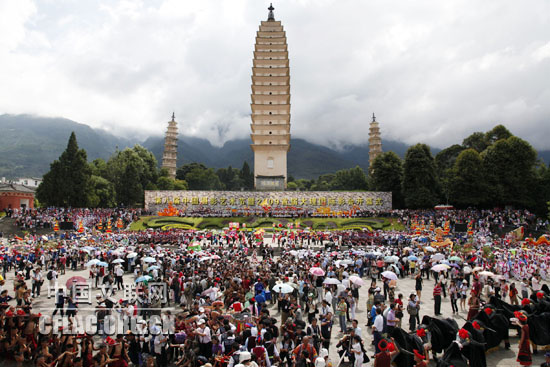 8月1日,由中国摄影家协会、中国艺术研究院(中国非物质文化遗产保护中心)、中共云南省委宣传部、中共大理白族自治州委、大理州政府、云南省文联、云南省农村信用联社联合主办的第八届中国摄影艺术节暨2009首届大理国际影会在云南大理崇圣寺三塔之下隆重开幕。图为开幕式现场。匡林华 摄