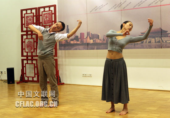 当地时间8月31晚,“今日中国”主题演出活动在柏林中国文化中心礼堂举办。图为北京雷动天下现代舞团舞蹈家宋婷婷、许一鸣表演现代舞《十月》。中国文联网 康伟 摄