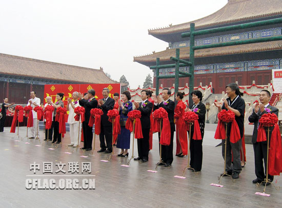 由中华文化联谊会、中国艺术研究院、河南省安阳市政府及台湾“文化总会”联合主办,中国艺术研究推广中心、台湾中华新文化发展协会共同承办,首届“两岸汉字艺术节”9月16日在北京太庙拉开大幕。图为嘉宾为“两岸汉字艺术节”开幕剪彩。中国文联网 冉茂金 摄