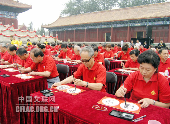 由中华文化联谊会、中国艺术研究院、河南省安阳市政府及台湾“文化总会”联合主办,中国艺术研究推广中心、台湾中华新文化发展协会共同承办,首届“两岸汉字艺术节”9月16日在北京太庙拉开大幕。图为两岸书法家及书法爱好者共同书写“汉字”。中国文联网 冉茂金 摄