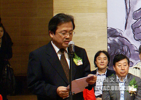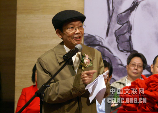 10月10日,由文化部、上海市政府主办的“行行复行行——方增先人物画大展”在中国美术馆开幕。图为中国文联党组成员、副主席冯远致辞。宋斌 摄
