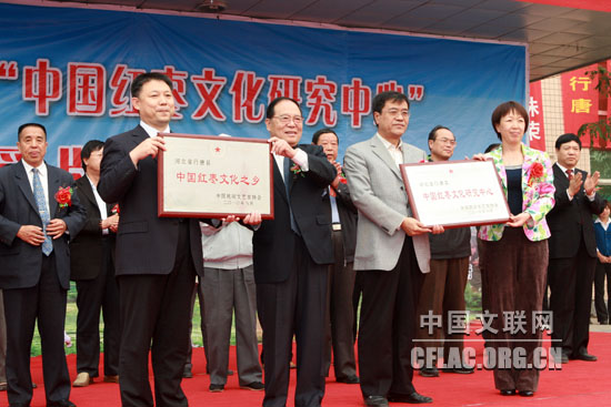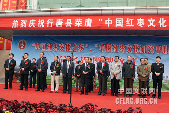 10月9日,由中国民协、河北省文联主办的“中国红枣文化之乡”命名暨“中国红枣文化研究中心”授牌仪式在河北省行唐县举行。原河北省政协副主席刘健生,中国民协副主席刘铁梁,中国民协副主席、河北省文联副主席郑一民,中国民协分党组成员、副秘书长赵铁信,河北省文联副主席潘学聪,石家庄市委宣传部常务副部长王惠周及行唐县有关领导出席了活动。刘健生、赵铁信、潘学聪和行唐县县委书记李震国分别致辞。刘健生和刘铁梁为行唐县授牌。