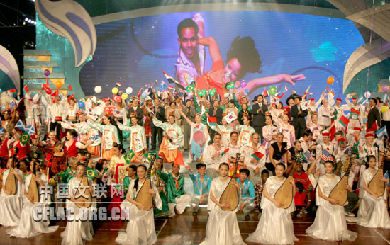 在颁奖典礼上,中外艺术家们奉献了精彩的节目,和现场观众进行了热烈的联欢。中国(苏州)艺术团的《美和爱的和声》传递了中国的热情好客,歌唱了友谊的纯真永恒;捷克维萨坎民间舞团的《瓦拉几亚民间舞》热烈欢快,展现了瓦拉几亚地区人们欢庆节日的场面;韩国田银子舞蹈团的《花扇舞》华丽典雅,展示了韩国传统舞蹈的迷人魅力;苏格兰戈登舞蹈学校艺术团的《苏格兰精神》在委婉动听的风笛声中,向往着苏格兰美好的未来;埃及拜尼斯维夫民间舞团的埃及民乐演示,载歌载舞,显现出埃及古老文明的悠久灿烂;巴西北大河州联邦大学民间舞团的《桑巴和肖特》幽默风趣,反映了欢庆丰收的喜悦之情;西班牙乔尼弗拉明戈舞团的《过客》以独特的肢体语言和强烈的音乐,展现了弗拉明戈舞的精髓;南非文化艺术团的《WAKA WAKA》通过模仿足球运动的舞步,展示了南非人民对足球世界杯的激情;古巴拉卡坦舞蹈团的《萨尔萨》节奏多变,渲染了追逐快乐的热烈愿望;土耳其促进基金会舞蹈团的《土耳其民间舞组合》结合当地丰富的民俗风情,用现代的舞蹈元素诠释了传统的文化主题;阿根廷卡图卢斯探戈舞团的《永远的探戈》节奏明快,给人以无限的激情和想象;库克群岛启明星舞蹈团的《草裙舞》以本地代表性的舞蹈,展示了热带岛屿的美丽风情;美国动力街舞团的《随心所动》动感十足,通过不同时期、不同风格的街舞,展示了青年人的活力;白俄罗斯国家歌舞团的《利亚沃妮赫》活泼奔放,展示了白俄罗斯年轻人蓬勃向上的朝气。一个接一个风格迥异、精彩纷呈的异国歌舞让观众看得如痴如醉,纷纷报以热烈的掌声。当《茉莉花》的旋律响起的时候,各国艺术家聚集到舞台上一起舞动和欢呼,真诚的友谊让大家没有了肤色的差别和国度的距离,气氛达到了高潮,现场成为了歌舞的海洋。