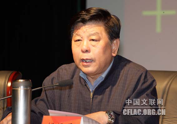 10月20日,中国文联传达贯彻党的十七届五中全会精神大会在中国文艺家之家召开。中国文联党组书记、副主席胡振民,党组副书记、副主席覃志刚、李牧,党组成员、副主席冯远、廖奔,党组成员、书记处书记夏潮出席大会。图为覃志刚传达党的十七届五中全会精神。中国文联网 孟祥宁 摄