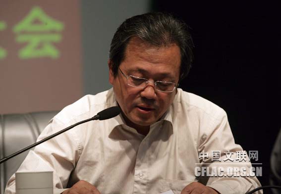 10月20日,中国文联传达贯彻党的十七届五中全会精神大会在中国文艺家之家召开。中国文联党组书记、副主席胡振民,党组副书记、副主席覃志刚、李牧,党组成员、副主席冯远、廖奔,党组成员、书记处书记夏潮出席大会。图为冯远传达党的十七届五中全会精神。中国文联网 孟祥宁 摄